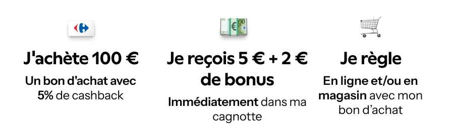 Vous achetez un bon d'achat de 100€ Carrefour chez Joko, l'application vous reverse 5% en cashback soit 5€ dans votre cagnotte. En plus et pendant 7 jours, Joko vous offre 2€ supplémentaires.
